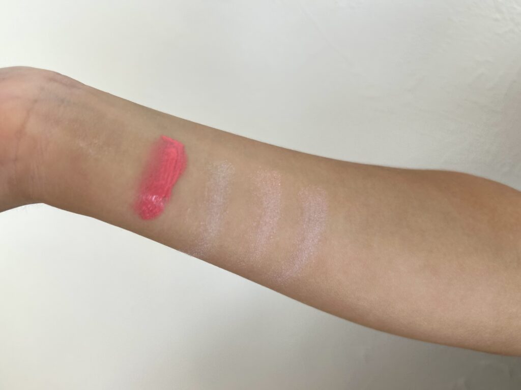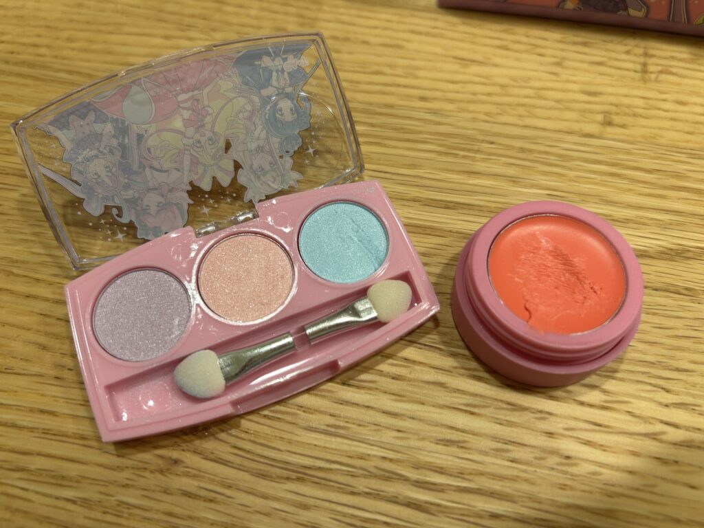 アイシャドウとチークの色味はこんな感じです。(子どもが早速触ってしまいグチャっとなっています)